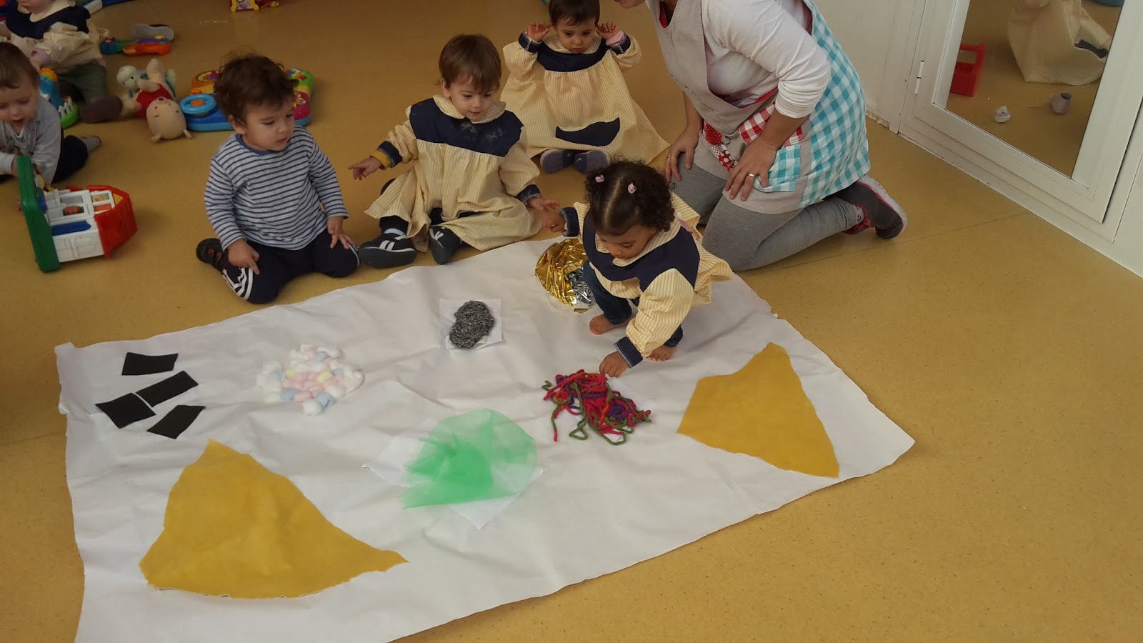 Los chicos de la clase 2-3 años han realizado una manta con texturas .